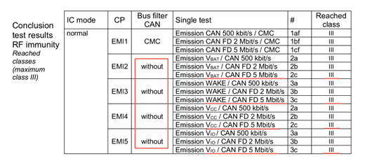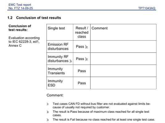 IBEE/FTZ-Zwickau 认证以 IEC62228-3 标准为依据,其测试体系直接聚焦芯片本身的 EMC 原生性能,同时在抗干扰功率、瞬态防护等关键指标上设置更高阈值,能更真实、严格地验证芯片在复杂车载环境下的稳定性。该认证涵盖四大核心测试维度,全面覆盖车载场景下的电磁干扰风险,而思瑞浦 TPT1043AQ 凭借优异的硬件设计,实现无特殊条件备注、全测试向量通过 Class-3 最高等级,具体测试表现如下表: