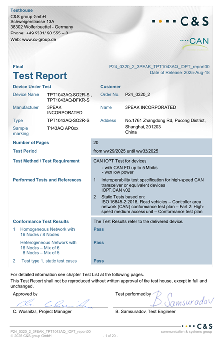 德国C&S 实验室(1995年成立)深耕车用网络通信领域,凭借多年开发与测试经验,已成为全球车载通信接口权威机构,其在互联互通、一致性及兼容性测试技术能力获行业高度认可,且与全球领先车企保持深度合作,认证报告是车载器件进入主流供应链的重要依据。